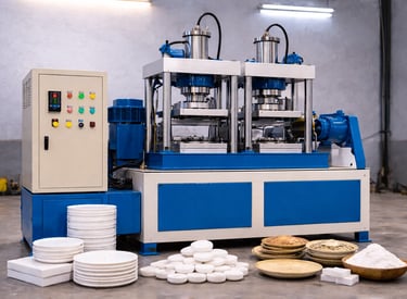 It is a high-efficiency machine used to manufacture disposable paper plates, bowls, and pattal thalis quickly for food service and packaging industries.