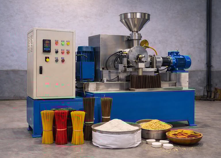 It is an automated machine designed to produce incense sticks quickly and uniformly for large-scale incense manufacturing businesses.